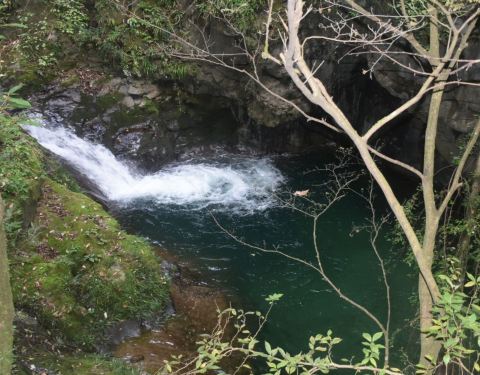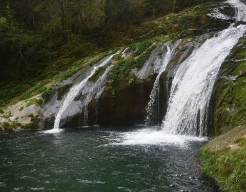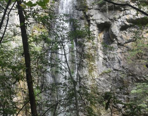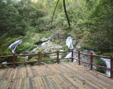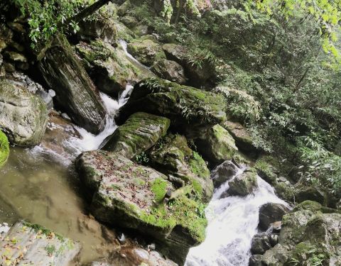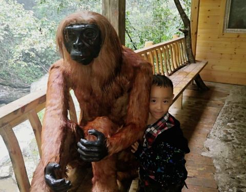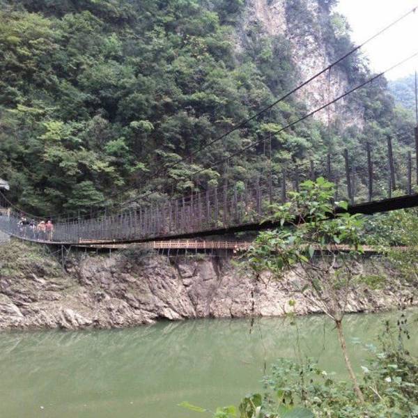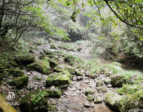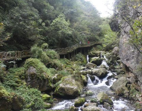 十一借着国庆假期来到野人谷,怀着憧憬带着俩娃雨中爬过的一条曲折的小道,先到一水坝,存着一湖不是碧绿的湖水,沿着崖壁上人工开凿的道路向前走,走到一条吊桥基本上湖已经到头了,迎面而来的是一条水流湍急的小河,清澈到底!一路走来都能听到哗哗的流水声,时大时微,不时的出现一条小瀑布从山上溜下,引得孩子驻足观察,途中有野人塑像,高空山洞里流出的瀑布,落差大概有三十米左右吧!还有一个假的野人在一长廊上安放,走近一看差一点吓坏小朋友,太逼真了!一路有雾蒙蒙的山影,郁郁葱葱树木,奇石堆积的河流,让孩子们玩的很开心,4岁半的孩子一路陪我们走到头,没有深入开发的自然景观,值得看。 【景色】