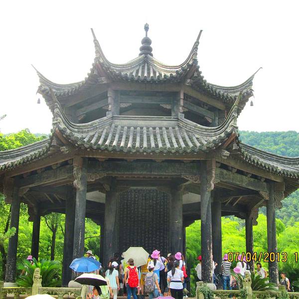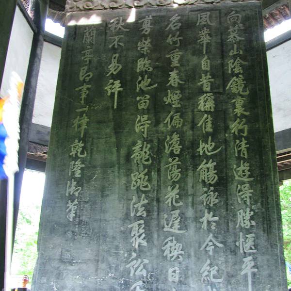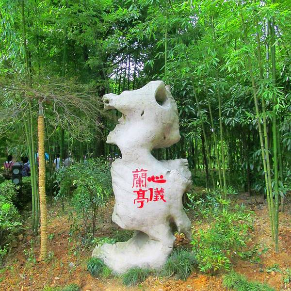 亭为八角重檐,下置青石围栏,是园内等级最高的建筑;内置高大碑石一通,正反面刻有清康熙乾隆两帝所题御碑。亭后青山层层,风景环境极好。兰亭在绍兴西南14千米的兰渚山下,是东晋时开发的一处游览风景区,永和九年(353年)春,王羲之等文人在此地集会,修楔赏景,并撰书《兰亭集序》,成为我国文学及书法史上的一件韵事。现存园林和主要建筑均为明中叶以后移园时重建的,园林可分为四个景区:戏鹅池及鹅字碑亭区、流觞曲水区。这二处位于入口内,地形起伏多变,茂林修竹,清流潺潺,清池内白鹅游水,给人以清秀怡人的观感。右军祠是纪念王羲之的小水院,殿前一泓清水名墨华池,四边游廊环绕,水中立有墨华亭,廊内墙上嵌古今书法碑刻百余通,是静赏艺术景的佳处。右军祠左后方为御碑亭区,这里地域开阔,林木荫翳,极为幽静,是大的山水观赏区