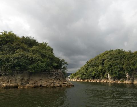 坐船荡漾湖面,欣赏湖中岩溶地貌和湖畔田园风光。
