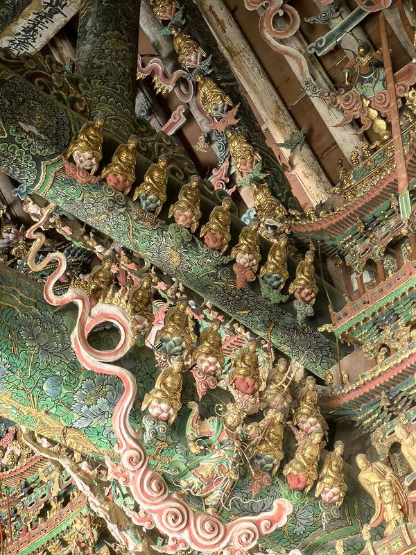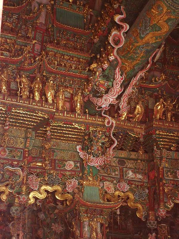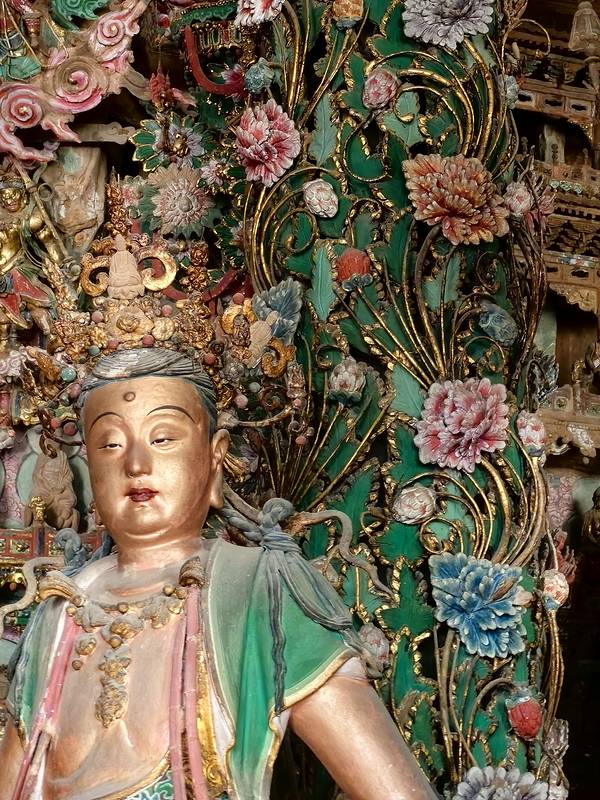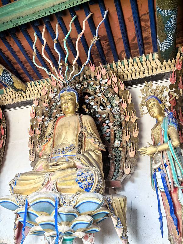 小西天门票35,导游费30,大雄宝殿在维修,只看到左半部份(两尊大佛),但也能看到令人惊叹的精美的悬塑、梁柱上的彩绘、十二乐伎菩萨、四大金刚等。导游讲大殿计划修五年,已经修了三年。有一紫檀木的韦陀像,无量佛殿有一木楼阁,是另一座寺大西天寺移来的。