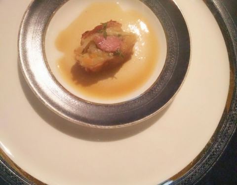 环境非常好,用的餐具都是银器,摆盘什么的都是法式非常传统的方式。吃的是午餐套餐,有选择红酒,这个价格还是很优惠的。前菜点的汤和虾,觉得鹅肝浓汤味道不错,虾是生姜味的,觉得这道菜非常好吃,不是很辣,...