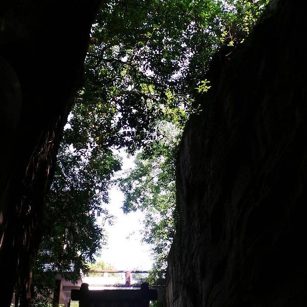 山下,一巨石中开,形成天然峡谷,谷深20余米,谷底有清泉缓缓流出,绕谷底没入石中,为一天然奇观