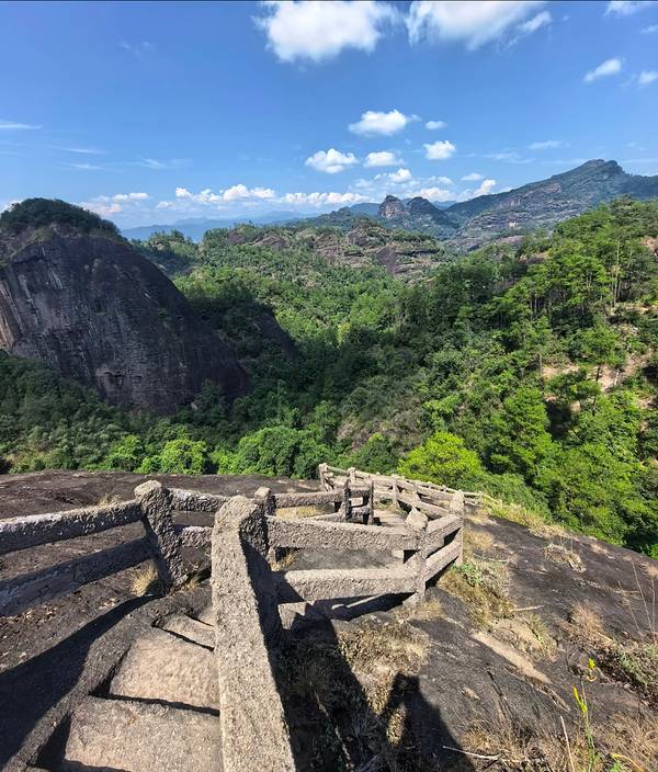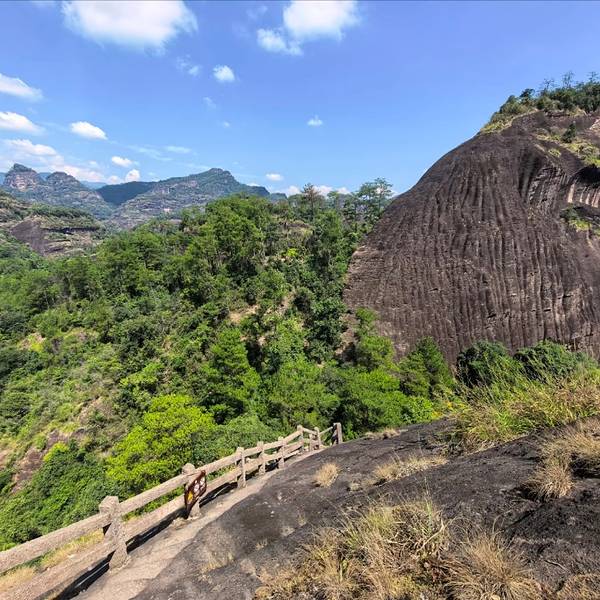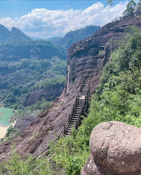 风景体验堪称顶级,是天然的自然课堂。登山沿途丹霞岩壁壮观,溪水、竹林、古树环绕,一步一景。半山以上可俯瞰九曲溪全景,碧绿溪水如带、竹筏点点,丹山碧水相映成画,晴天开阔、雨后云雾缭绕,随手一拍都是大片。孩子在行走中能直观认识丹霞地貌、观察昆虫草木、远眺溪谷风光,比书本更生动,既能开阔眼界,又能悄悄锻炼体力与耐力。