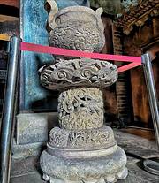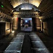 我们去的时候,看守大门的人用钥匙哗啦啦地打开锈迹斑斑的锁,红色斑驳大门吱吱呀呀的开门声和人间的尘光飘进这黑暗的沉寂里。师傅拉开电闸,说:“你们自己下去看吧,里面有灯”。于是地宫赫然呈现眼前,不由得让我打了个冷颤。大着胆子沿台阶一路下去,地宫的阴森让人不寒而栗。每往下走一步,寒气和阴森感便重一些,我的心,也紧一点。地宫里阴森潮湿,除了我们,没有其他游人,只站在地宫门口便觉得心里怕怕。