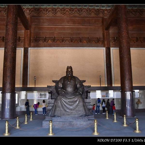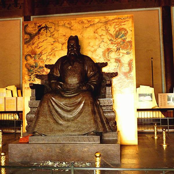 这祾恩殿很大,里面很空阔。中间有个雕像,一个相貌奇伟的皇帝端坐在椅子上的雕像,应该就是这长陵的本主儿--朱棣皇帝吧。
