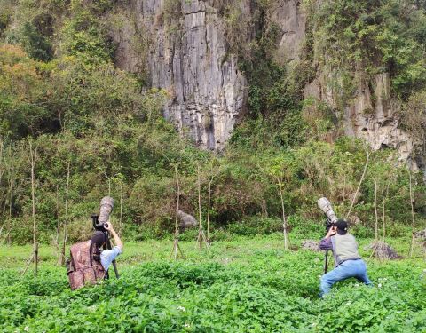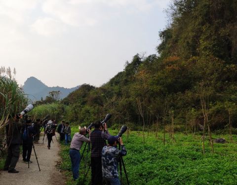 我们是大年初六下午去的,景区里除了大门口收停车费的和游客中心一个值班人员外,没有别的工作人员,电瓶车也没开,显得有点荒凉。景区不收门票,游客稀稀拉拉几个人,主要是扛着长枪短炮摄影的人。景区里非常开阔,四周群山环绕,景色很美,非常适合散心撒欢。在种甘蔗的村民指引下,我们很快在一座山下找到了白头叶猴的踪迹,一共有二十几只,周围聚集了很多人拍照。工作人员说我们很幸运,白头叶猴平时难得出来。