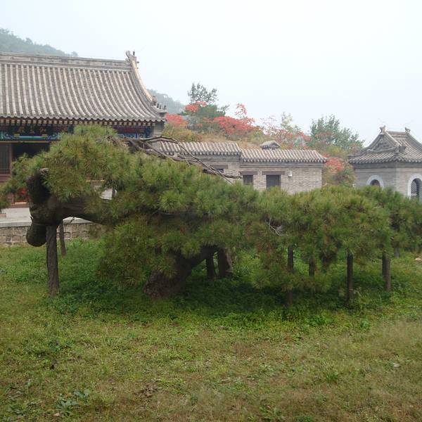 从庙宇高处俯瞰远山,景色很美。庙中的盘龙松和凤凰松很有名,松树长得的确很奇特。据说盘龙松以前被火烧过