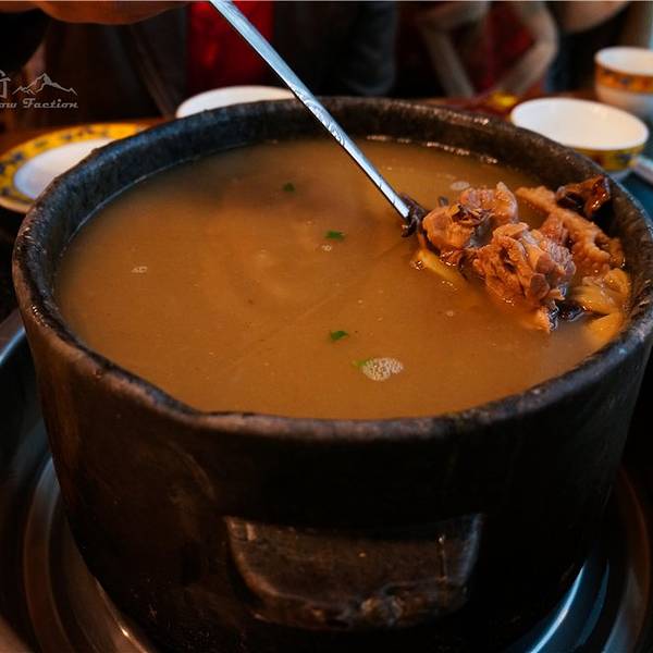 林芝的石锅鸡大名鼎鼎,去不了只能在拉萨城里找一家尝试,峰瑞石锅鸡评价挺高的,我们决定前去一试。高反折腾得我啥也干不了,只剩下吃这一项功能了。先上来一桌子小菜和酱料,都很好吃。石锅真是的大石头锅,满满一锅鸡汤,我们点的双人最小份,感觉有一点多,鸡肉的量不小,但是鸡汤是那种放了淀粉浑浑的稠稠的口感,跟想象中的鸡汤不太一样。味道分量都没得说,就是性价比不算高,最便宜的小锅两人份199元,不是很值。但是拉萨餐饮物价就是高的离奇,好吃的又少,所以为了这口鸡汤就忍了吧~