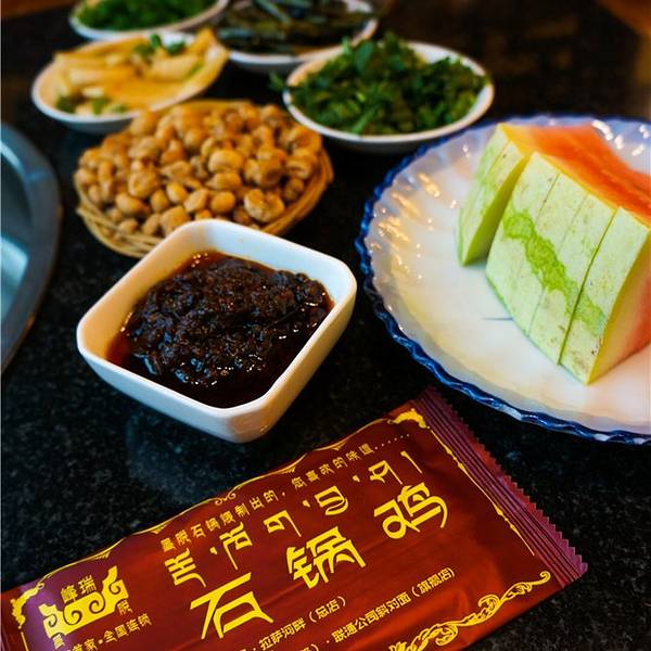 林芝的石锅鸡大名鼎鼎,去不了只能在拉萨城里找一家尝试,峰瑞石锅鸡评价挺高的,我们决定前去一试。高反折腾得我啥也干不了,只剩下吃这一项功能了。先上来一桌子小菜和酱料,都很好吃。石锅真是的大石头锅,满...