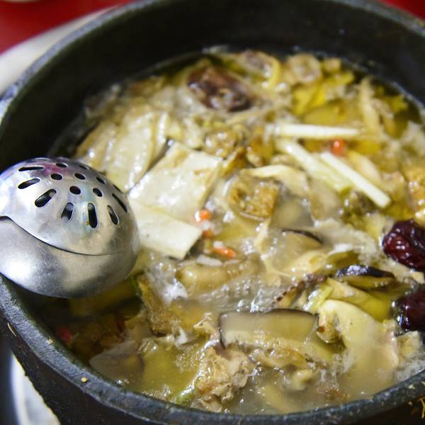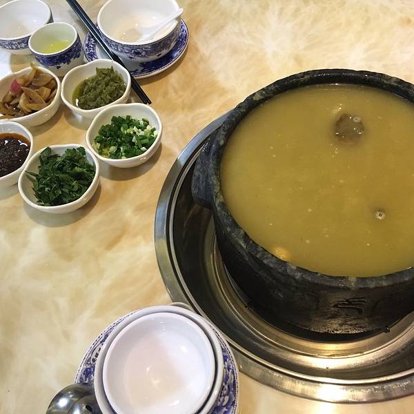 我们到的时候人还不算多,等上菜的时候服务员会给一碟炸的玉米粒超级好吃的!石锅很高很烫,所以吃的时候要小心点。汤非常浓,菌菇的味道很重,特别喜欢。可惜鸡块不多,价格挺高的但是料放得不足啊!
