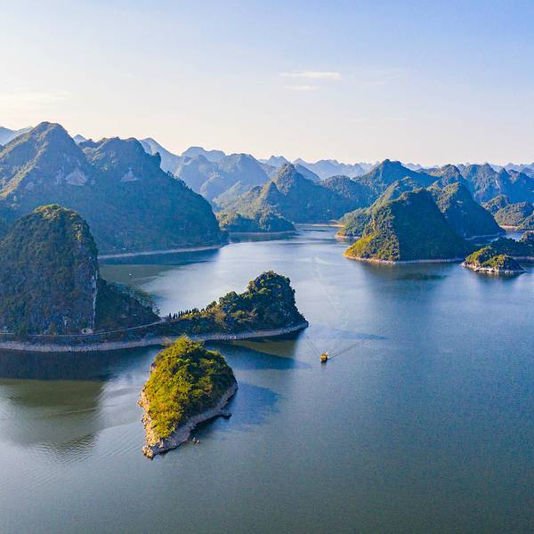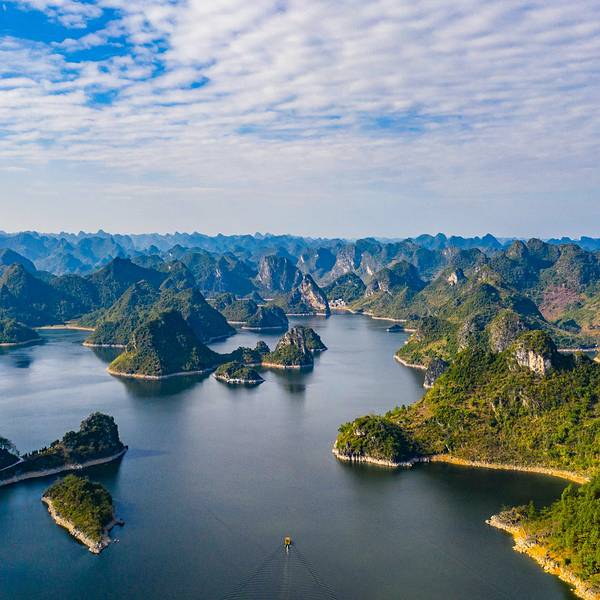 大龙湖景区位于上林县西燕镇,由大龙湖和大龙洞两部分组成,大龙湖被群山环抱,拥有迷人的喀斯特地貌景观。在这里,不仅可以乘坐游船泛舟湖面、欣赏山水美景,还可进入湖岸边的大龙洞一探溶洞秘境。 大龙湖是人工拦蓄地下水而成的人造高山平湖,湖中有14座天然小岛。游客可以乘坐游船游湖,欣赏白龙飞天、睡美人山、鲤鱼山、企鹅山等自然景观,这里连绵的石山宛如一幅山水国画,堪比桂林山水,因此有人把这里比作“水上桂林”。 在游船途中可见到湖岸有不少山洞,其中名气较大的莫过于大龙洞。大龙洞有12个游览厅,每个大厅各有风光,钟乳石千姿百态,形状怪异。洞顶有3个天然的天窗,洞中有水,水中有洞,洞中见天,深邃曲折。