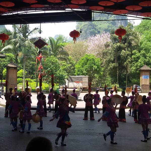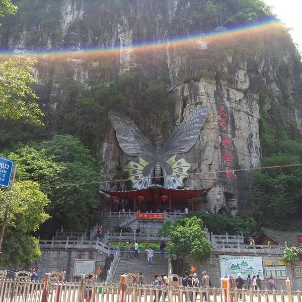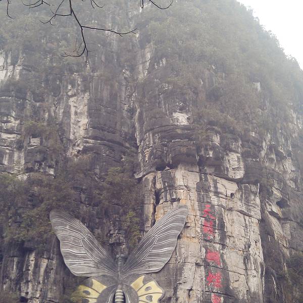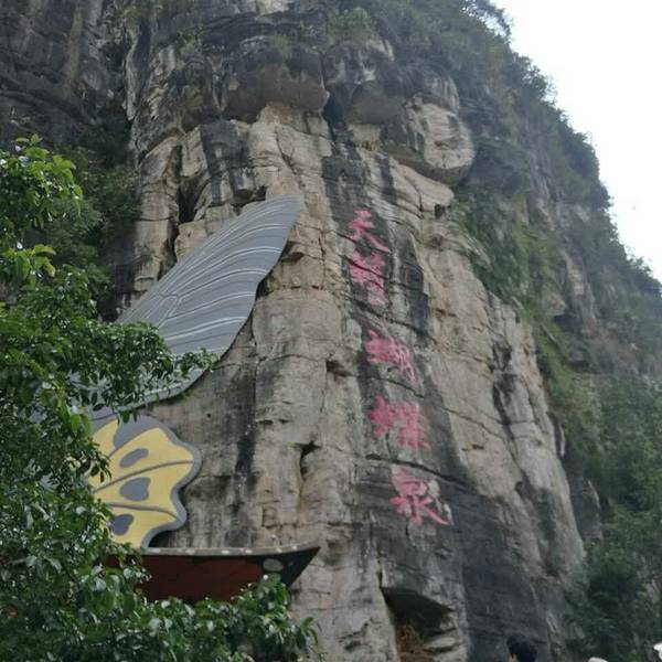 天籁·蝴蝶泉是位于十里画廊沿线的景点,距离阳朔县城和月亮山都只有三四公里,也是许多旅游团会游览的景点。景区内很有意思的是苗族和侗族的歌舞表演,另外也有一个小规模的溶洞可以参观。 景区门口很远就能看见石壁上一只巨大的蝴蝶雕塑,这也是景区的标志。景区内有一个不大的溶洞,洞中有一处看似蝴蝶的钟乳石,有泉水流出,因此称作蝴蝶泉。不过,这里并不能看到大群野生的蝴蝶翩翩起舞,倒是能看到蝴蝶展,十里画廊观景台拍出的照片视角很赞,而山中的吊桥和滑梯则受小朋友喜欢。游览溶洞、爬山都不需要太久,下山后便可直接去看表演了。 相比自然景观,这里的少数民族歌舞表演更为精彩,有准寨花、金花、堂主展示,能让人感受到浓浓的民族风情。演出结束后,你也可以去找演员们合影,不过合影是要收取一定费用的。 景区山下有一片卖民族纪念品的区域,感兴趣也可采购一点回去送亲友。