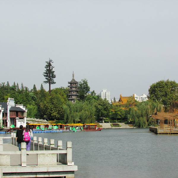 白鹭洲内最值得一看的就是这座拱桥了,旁边有木雕的白鹭,传说过去常有白鹭栖息于此,这也是公园得名的原因。拱桥倒影于湖水之中,伴随两岸杨柳依依,美景可赞!公园里有着为数不多的亭台楼榭,但由于这儿的人非常少,所以显得非常宁静,没有热闹的感觉;偶尔能看到一些遛鸟的老人,好不潇洒。公园内的游船基本都没有什么人坐,所以总感觉冷冷清清的,间或看到三三两两的旅客也是百无聊赖,走一走就歇息在那了。