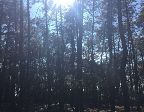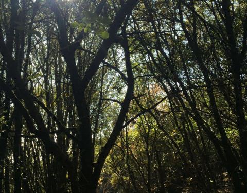 在树林中穿梭,阳光从树叶的缝隙中透过,星星点点