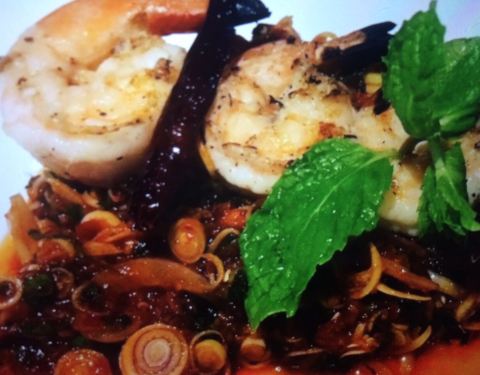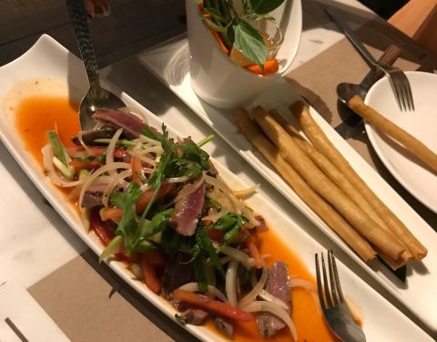 Absolutely delicious. Big menu with lots of choice and really helpful and friendly staff. The "mocktails" were fantastic as well. Salad with beef, popcorn shrimp and spring rolls.