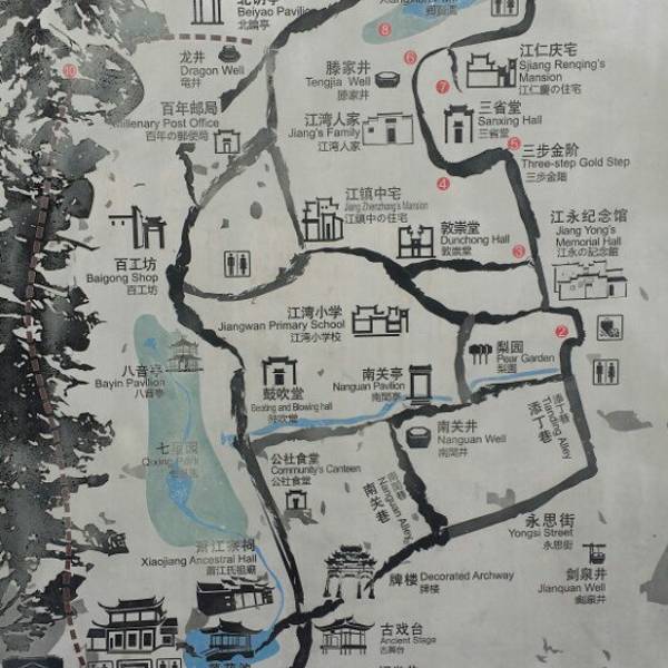 江湾景区是一座具有丰厚历史文化底蕴的古村落,位于婺源县东北部。江湾景区的建筑布局极具特色,一街六巷,纵横交错,从后龙山俯瞰,巷道间竟构成一个硕大的“安”字,令人叹为观止。古镇入口即是规模庞大的“萧江大宗祠”,是婺源乃至江南很大的宗祠,尽显王室气派。祠堂分前院、前堂、中堂、后堂四进,祠内的砖雕、木雕、石雕形态逼真,清丽高雅。江湾人引以为骄傲的是后龙山,自古以来,江湾人不准任何人动后龙山上一草一木,生态环境保护的非常好。走进后龙山,就如同走进了原始森林,满山古木,遮天蔽日,给依山而建的江湾古村增添了不少神韵。江湾文风鼎盛、群贤辈出,孕育出了清代经学家、音韵学家江永,明代隆庆年间户部侍郎江一麟、清末著名教育家、佛学家江谦等一大批学士名流,是当之无愧的婺源“书乡”代表。村庄内现在还保存着江永纪念馆,三省堂,敦崇堂,培心堂,东和、南关、西安、北钥四座古门亭,岳武穆构筑的岳飞桥,明代剑泉井等古老的徽派建筑,非常值得一看。此外,游人还可以在百工坊、鼓吹堂、公社食堂等景点中体会旧时手工艺匠人的传统技艺,更可观赏徽剧、婺源民歌等传统剧目。