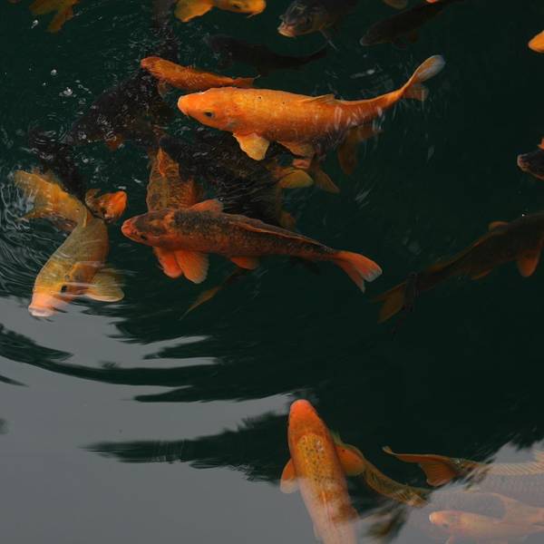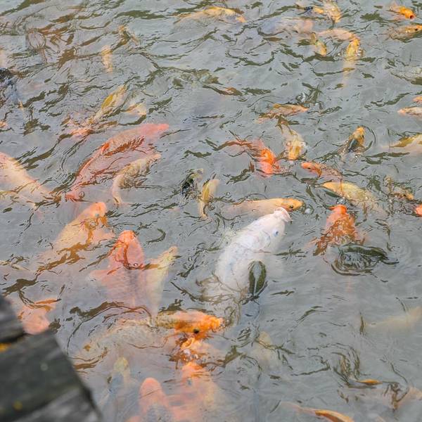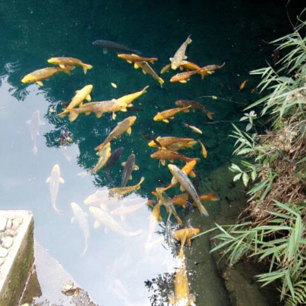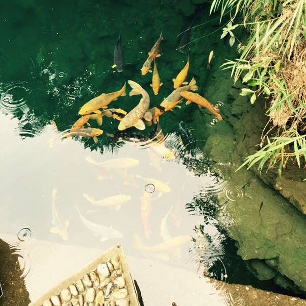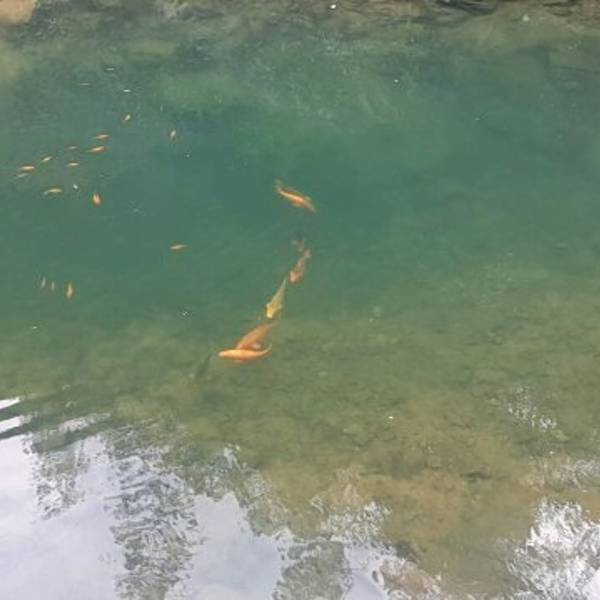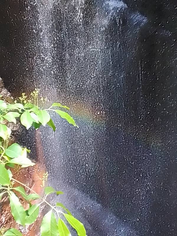 半途中有一池碧水,里面的锦鲤鱼群如画布上的景象。一挂瀑布经常能形成彩虹,美丽而神奇。