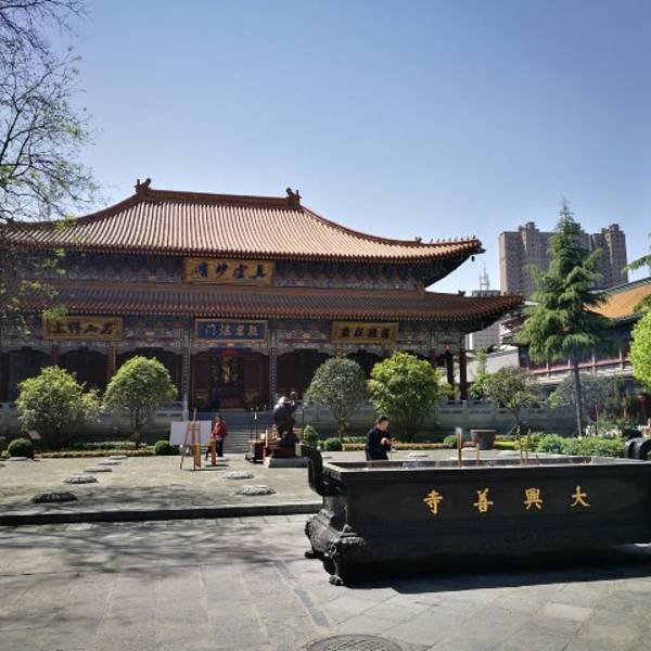 大兴善寺始建于晋初,距今1600余年,是西安现存历史悠久的佛寺之一。隋唐时代,由印度来长安留学的僧侣,曾在寺内翻译佛经,因此成为当时长安翻译佛经的三大译场之一。 大兴善寺既是一座具有悠久历史的佛家寺院,也是一处旅游观光胜地。在繁华而喧闹的古都西安,大兴善寺古柏森森,遮天蔽日,给人以无限的幽雅与肃穆。目前现存都是明代建筑,至今保留着唐代转轮藏经殿遗址,高出地平面1米,略呈方形。 大兴善寺现存寺院建筑沿正南正北方向呈一字形排列在中轴线上,是研究大兴善寺的宝贵资料;后殿藏有唐代铜佛像和宋代造像,形态各异,也是大兴善寺的法堂。