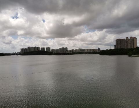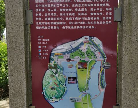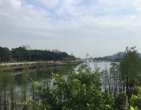 阳江市区中心很大的一个湖,湖面波光粼粼,有潮来潮往的感觉。公园内郁郁葱葱,有亭台廊桥,有环湖的行道但南端有一截无人行道。