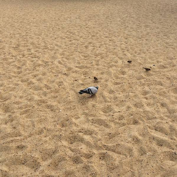 但是我发现海里有2个人在游泳呢~佩服我开始觉得沙子...海滩边先看到这样的休息区~人比较少~悠闲的感觉~鸽子麻雀也自由自在