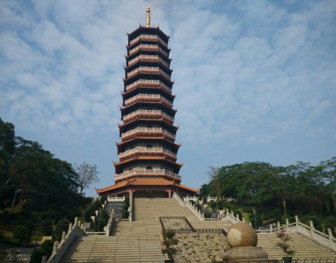 要爬山的,爬到好累,到了塔上可以开阔地看江门市区全景,爬塔也爬了好久,有公交车到这里山脚下,到了山顶上好像没什么人。