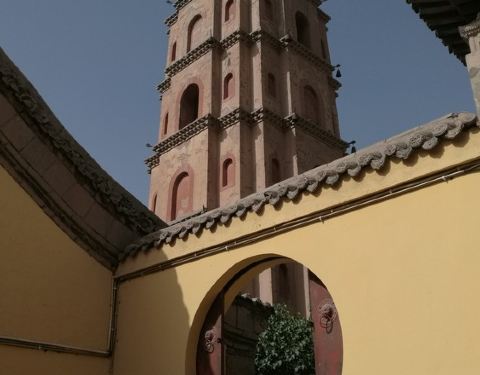 这塔的塔身形成许多梭角,其结构与银川市的海宝塔十分相似,但比海宝塔矮小,不失古朴壮观