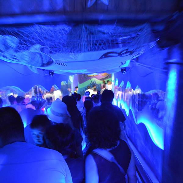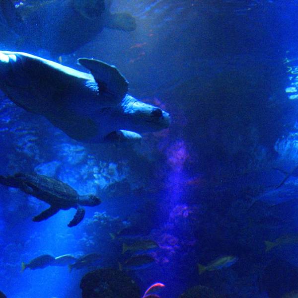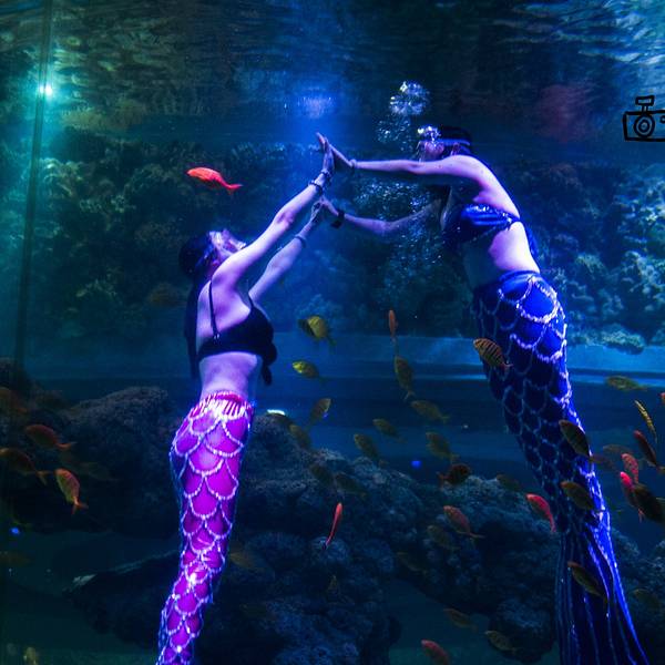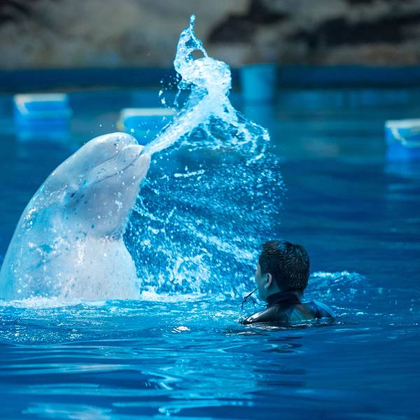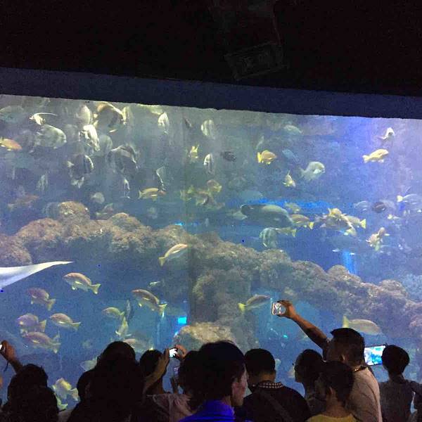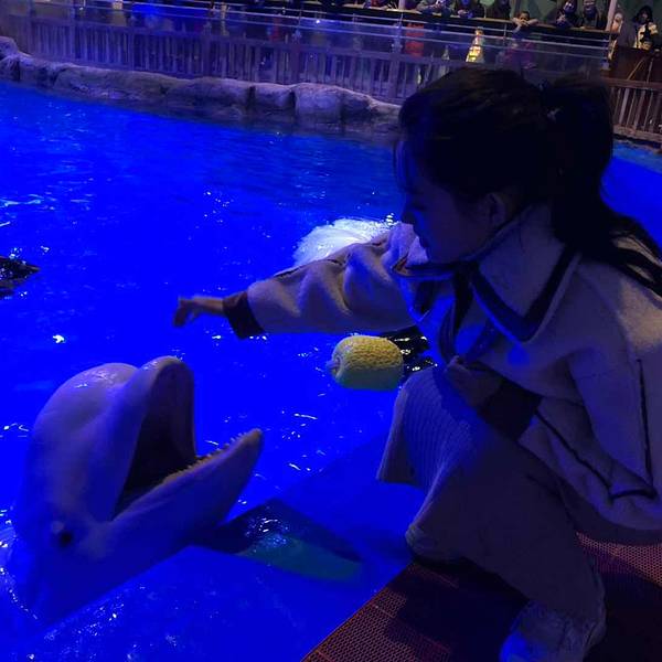 看白鲸及海豚表演,漫步海底隧道,看大鲨鱼在身边穿梭。