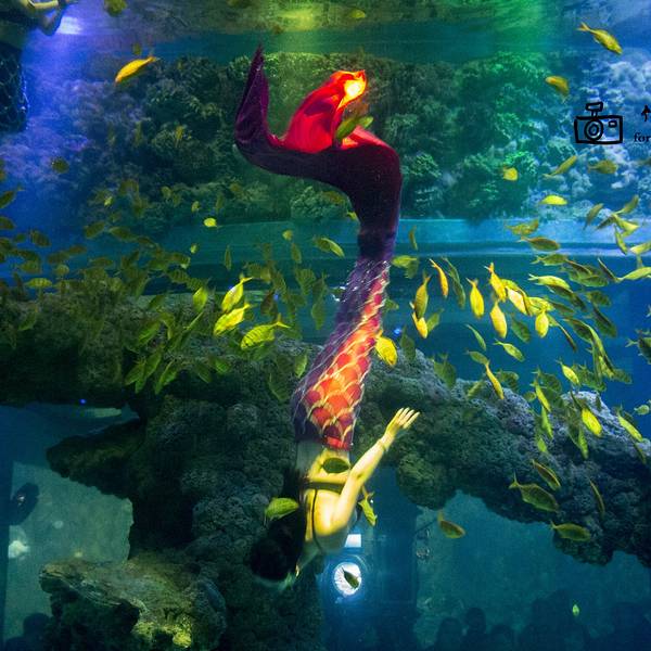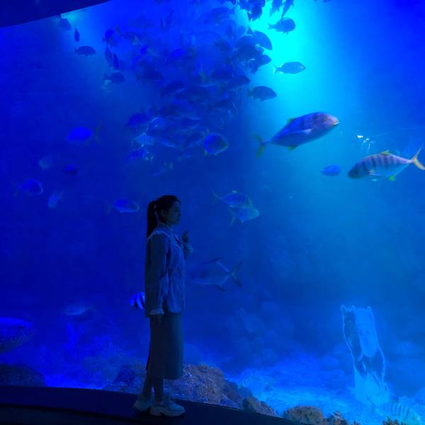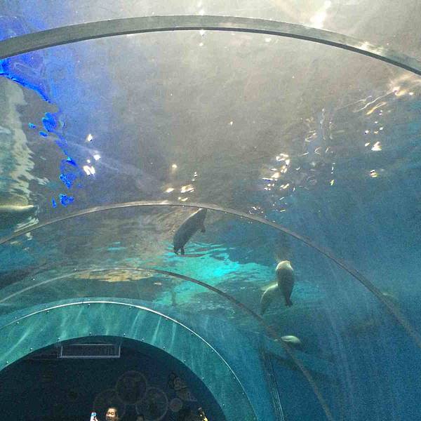 【点评】:刚进入馆内会有一种压抑的感觉,密封的空间,深海蓝的色调,会给人喘不过气的感觉,当然也是因人而异的,也许在刻意营造一种深海的感觉,带你进入海洋世界。感觉不舒服的人建议很快的走过这一段区域!这里的科普教育做的非常好,一方面宣传科普海洋极地知识,会有各国在南极设立科考站的资料,观光隧道设计的非常不错,让我们仰望深海的景观和动物,但是会总有一些比较懒的海豹海狮趴在隧道的玻璃上,蠢萌蠢萌的比较可爱,美人鱼的表演也在这里进行,两条美人鱼潜入水底伴随着鱼群游动,总是可以吸引大批的游人来观赏,各个区域中间会穿插一些饮食区域,方便游客补充能量。另外每天会有几场欢乐剧场的表演,白鲸、海豹、海豚等动物的表演,人和动物能够和谐相处,也会有幸运的观众上台和海洋动物一起互动,表演结束也可以去和它们合影,不过是要另收费的。