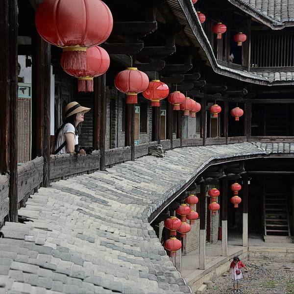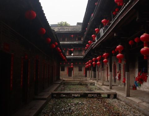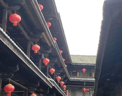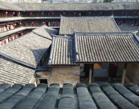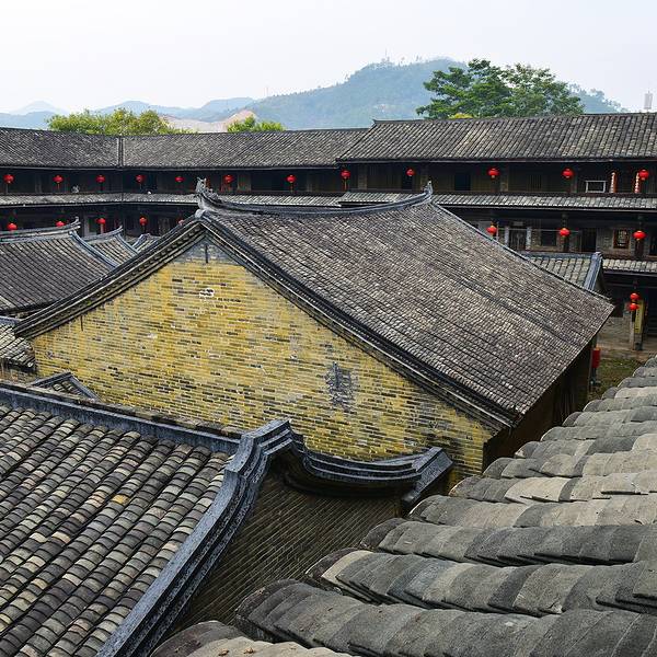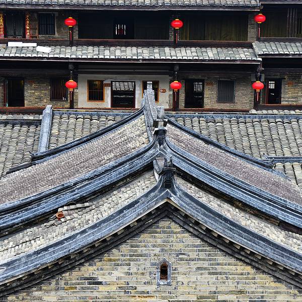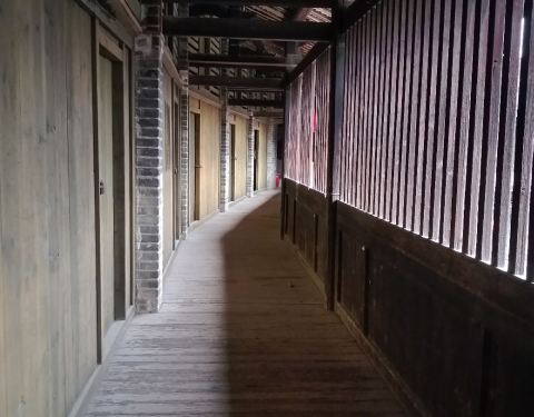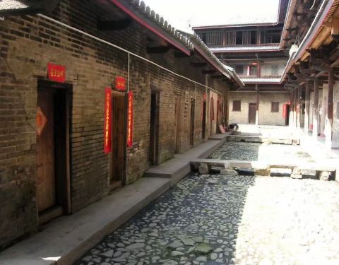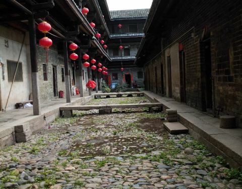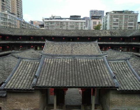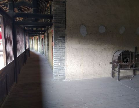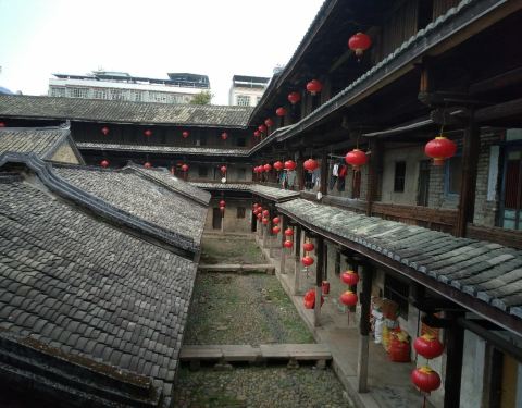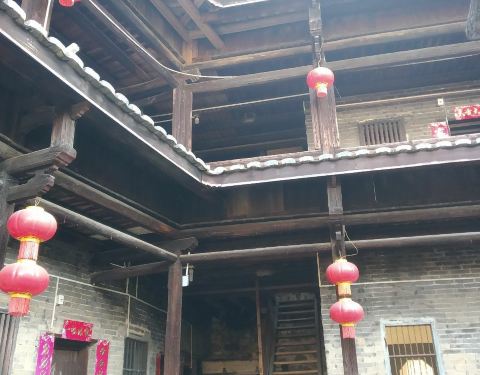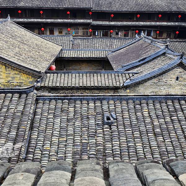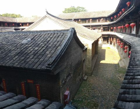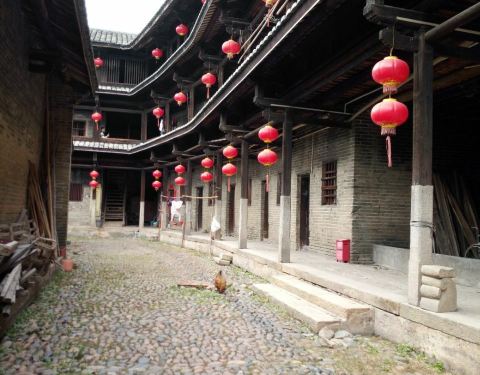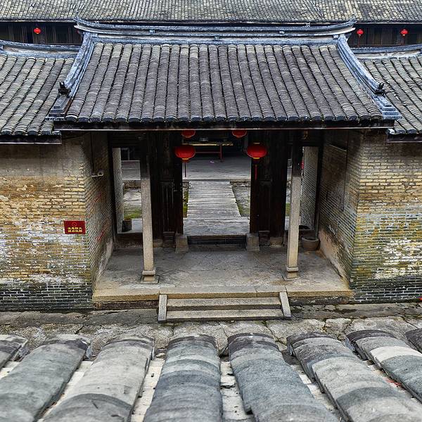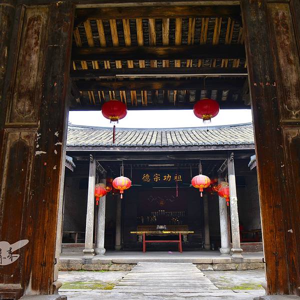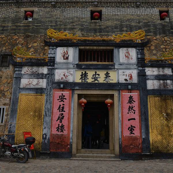 泰安楼的大门非常独特,建造泰安楼的主人蓝少垣和大埔所有的围屋主人一样,皆因发家致富而建,当时没...被高楼环抱的泰安楼位于梅州大埔,建于1764年,是难能可贵的客家石方围楼建筑。一二层楼外墙为石墙,三层为砖墙,因而被称为石楼,已经在风雨中飘摇了200多年。时光被掩埋在斑驳的墙瓦,而隐藏在其中的客家文化却...被高楼环抱的泰安楼位于梅州大埔,建于1764年,是难能可贵的客家石方围楼建筑。一二层楼外墙为石墙,三层为砖墙,因而被称为石楼,已经在风雨中飘摇了200多年。时光被掩埋在斑驳的墙瓦,而隐藏在其中的客家文化却依然闪闪发亮,我无法想象它曾经的繁华,却在它遗世的影子中读懂它的孤独。曾经百十户人家合住一楼,嬉笑怒骂里隐藏着人情世故,而今,空空荡荡的泰安楼,只徒留清冷的几户。悬挂的红灯笼迎风逍遥,却透着清冷的影子伴着孤灯低吟浅唱着无声的歌。泰安楼的大门非常独特,建造泰安楼的主人蓝少垣和大埔所有的围屋主人一样,皆因发家致富而建,当时没有功名不可建造门楼,泰安楼的主人灵机一动,把门镶嵌在墙体,便有了如今我们看到的“豪门”。门前的半月型池塘还畜着一池绿水,只是主人早已魂归故土。200户房间仅设有一个大门,出于保护的需要,楼上还设有枪眼,客家围楼的烟囱通常都设在墙壁里,就算天井内还留着吃用的水井,却依然找不到房屋被烟火熏过的痕迹。楼内中轴线主体建筑为平房,分上下二堂,上堂门牌写着“祖功宗德”四个大字,屋内陈列着蓝氏先祖神主牌,并作为祭祀的祠堂,堂左右两侧设有厢房,楼内平房四周为天井。在客家建筑里,风水师把天井视为内太极,客家人常常称天井为天池,三层方形楼房把主体平房环抱在中间,形成楼中有屋、屋外有楼的格局。走上楼梯,越过楼上一间间房,鞋子在木板上叩下节奏的响声,弹起一缕缕灰尘,走得远了,仿佛声音也绝尘而去,眼前的青砖墨瓦好似围起的江湖,只是江湖还在,人却早已远去。