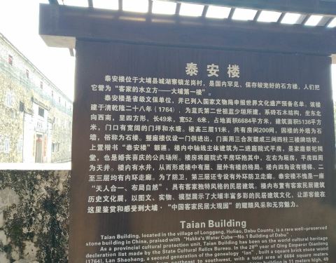泰安楼位于广东省大埔县湖寮镇龙岗村。门匾“泰”字少了一点,成了泰安楼一大特色泰安楼位于广东省大埔县湖寮镇龙岗村。门匾“泰”字少了一点,成了泰安楼一大特色。一座三层石方楼,楼中有屋、屋外有楼的格局。