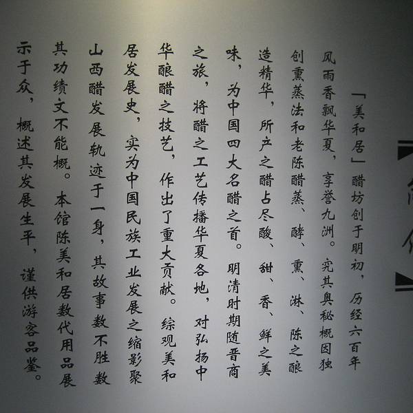 华夏第一醋,果然有够虎!黑色大醋缸,整齐排两行,要的就是这种眼前一亮的赶脚!赶上小盆友也来参观学习,看着这些穿着黄色小褂子、叽叽喳喳叫的小娃子,内心无限感慨,想当年小编也是这么可爱,而现在,小生只想上去抱抱他们....................的老师~美丽温柔又可爱的讲解妹子一路耐心讲解,谈古道今,说历史讲人文,总结下来就三句------山西醋文化博大精深,造醋产业源远流长,这些长的短的圆的方的黑的白的黄的黑的都是老祖先遗留下来的历史见证。老陈醋,能大补,造醋工人最少都活九十五。每天来一杯,绝对能奔二百五!造醋五大秘方造醋五大步,字虽然好读,做起来很苦!墙上的上百个字咱都认识,文化人,就是这么自信!黄豆黑豆红豆绿豆大豆各种泡,大米小米黑米薏米玉米各种造,独家秘方不外传!看名字,隔着屏幕都能闻到一股酸味~~~~大醋缸子好,大醋缸子妙,酿出的醋能呱呱叫!酿醋工坊走一遭,虽然不明白,但是赶脚很厉害!如果你进过大棚,可能只会感到闷热,但是如果你敢进这里.......