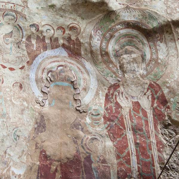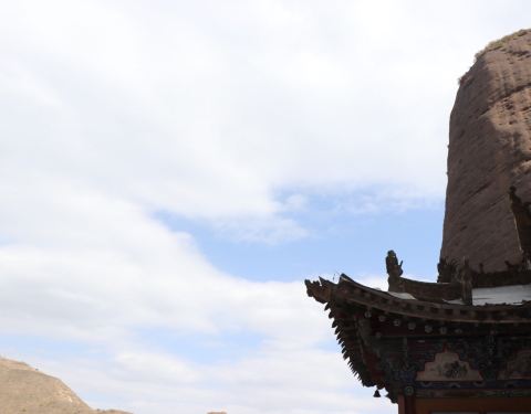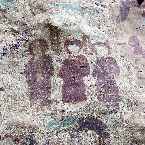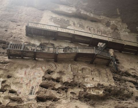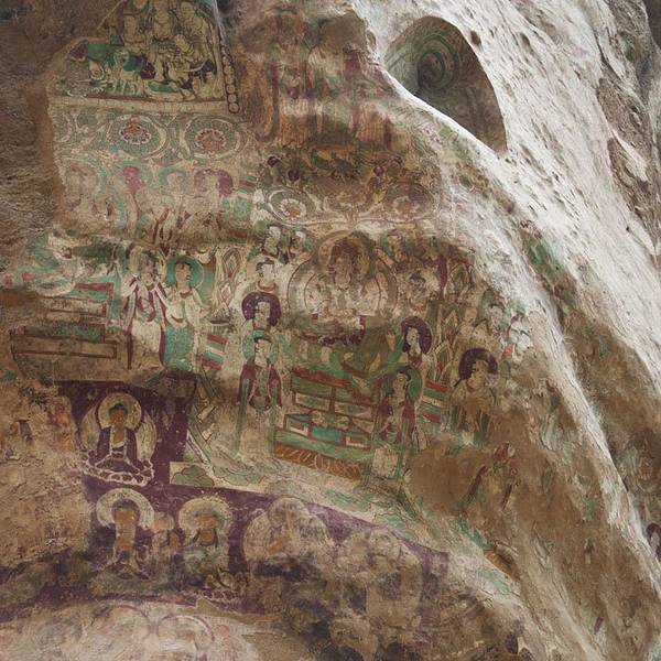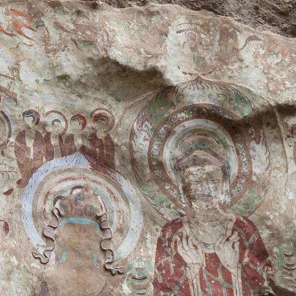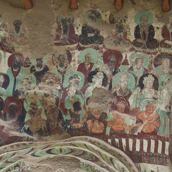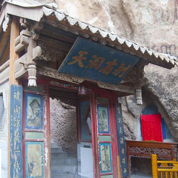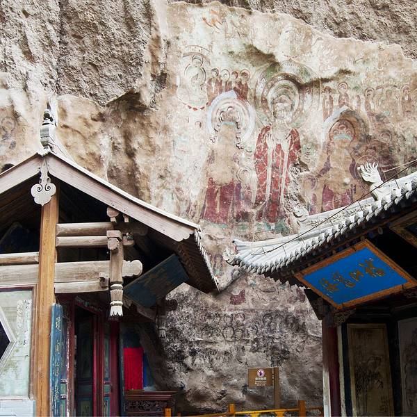 北1公里,有千佛洞,原有7窟,现残存壁画绘千佛、说法图、飞天、供养人及牛车,具北周风格,画面着色瑰丽,残存造像,圆润丰满,神态各异。以拉稍寺、千佛洞的摩崖题记、雕塑作品、壁画及木构遮檐最为珍贵。