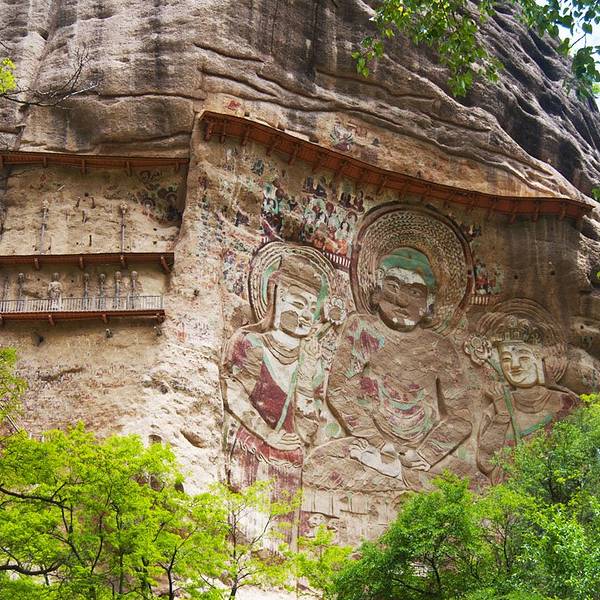 水帘洞石窟群,渭河流域仅次于麦积山石窟的大型石窟群,有世界上最大的露天摩崖浮雕大佛,在高、宽各...水帘洞石窟群,渭河流域仅次于麦积山石窟的大型石窟群,有世界上最大的露天摩崖浮雕大佛,在高、宽各60米的凹形崖面上,浮雕泥塑了一佛二菩萨,大佛通高42.3米。水帘洞石窟群始建于十六国后秦,经北魏、北周、隋...水帘洞石窟群,渭河流域仅次于麦积山石窟的大型石窟群,有世界上最大的露天摩崖浮雕大佛,在高、宽各60米的凹形崖面上,浮雕泥塑了一佛二菩萨,大佛通高42.3米。水帘洞石窟群始建于十六国后秦,经北魏、北周、隋、唐、五代至宋、元、明、清各代增建重修,现存有七寺五台,水帘洞、拉梢寺、千佛洞、显圣池四个单元,历代造像百余尊,壁画三千多平方米,浮雕和半圆雕佛塔八座,古建筑物十多座,舍利塔十二座,题记碑刻二十九通,是把浮雕、窟龛、悬塑、壁画相结合的露天石窟寺,在全国仅有。据《武山县志》载,鸠摩罗什从龟兹到姑臧(今武威),又途经武山县地区,后到达长安。在水帘洞建过梵宫僧舍,使拉梢寺声名远扬。 展开
