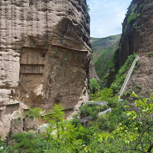 路程:甘谷县出发,走连霍高速,约1小时路程。下高速有段两车道的进山路,路面偶有不平整之处,路上车少,基本是沿着河...位于天水市武山县境内的水帘洞内🈶️世界第一大露天摩崖雕像——拉梢寺大佛,北周时期。