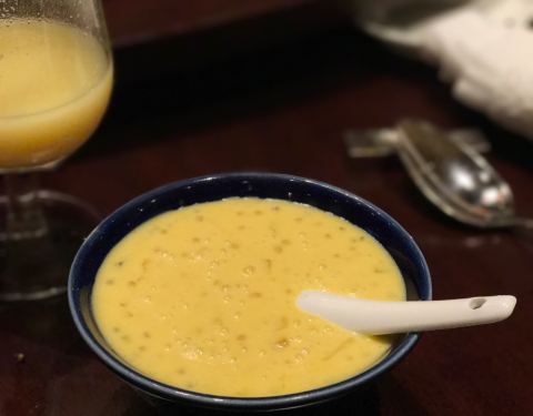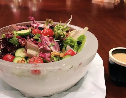 吃了三年后,中餐厅终于算是换了新菜单,开始主打融合菜。大包间的环境让人满意,商务宴请与大型家宴都不在话下。 桌子中心的小盆鲜荷花骨朵取自白洋淀,视觉效果极佳,看的我都想抱几盆回家。 麻婆豆腐的定制版使用牛骨髓、牛肉末与豆腐搭配,爽滑的荤素食材水乳交融,辣度降低,倒是适合不太能吃辣的人; 那个冰碗沙拉也是颜值与口味俱佳,真正的大冰碗容器很有视觉冲击力~