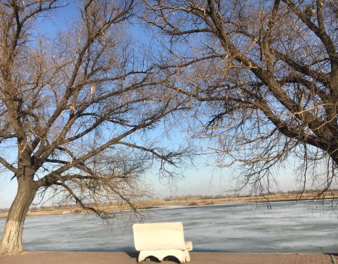 ...嫩江穿过公园 冬天结冰 公园内有许多大树自然生长 没有修饰的公园 有健身器材 沿江垃圾无人打扫