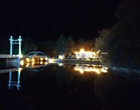 吊桥公园我是晚上下着蒙蒙细雨时去的,感觉比白天更有一番滋味。晚上在灯光的映射下,吊桥显得更加多彩!可惜的是正赶上处于维修之中,没有上去。