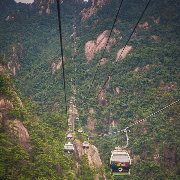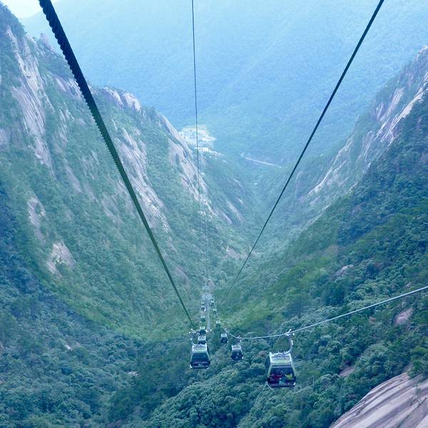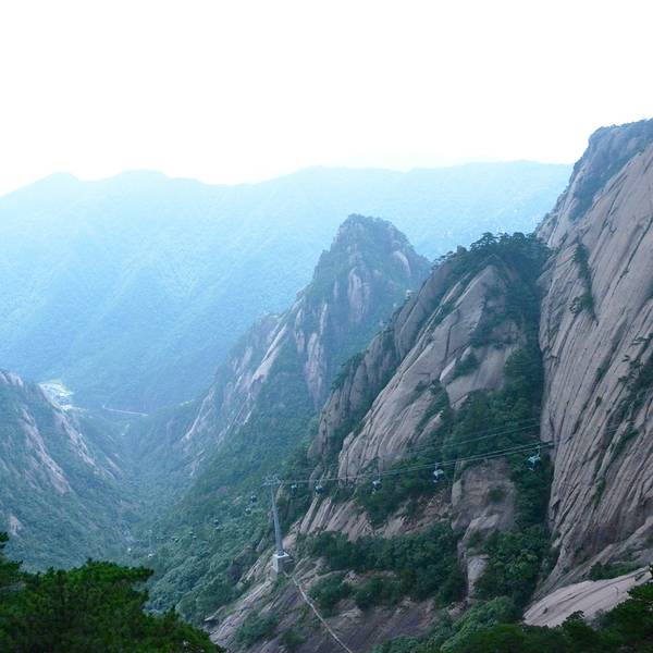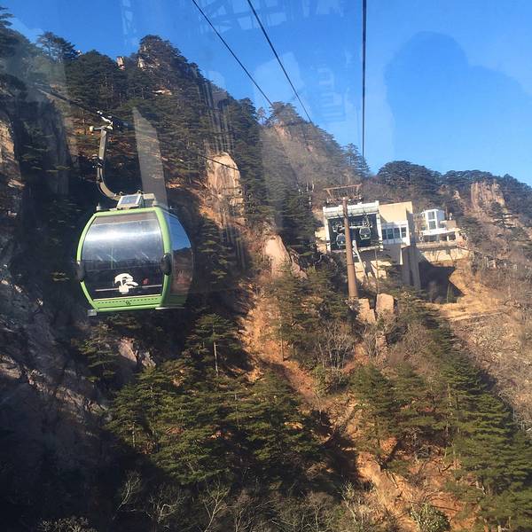 漫长的排队检票后乘坐19元的景区巴士,在盘山路上开了好一段才来到乘索道的地点,前方继续是黑压压的一片人头,黄山一年四季都是这样的火爆,尤其是节假日。黄山的索道为全景天窗,观光效果很不错,只是苦了那些恐高的人,同箱有两位阿姨几乎是全程闭眼坐完全程。