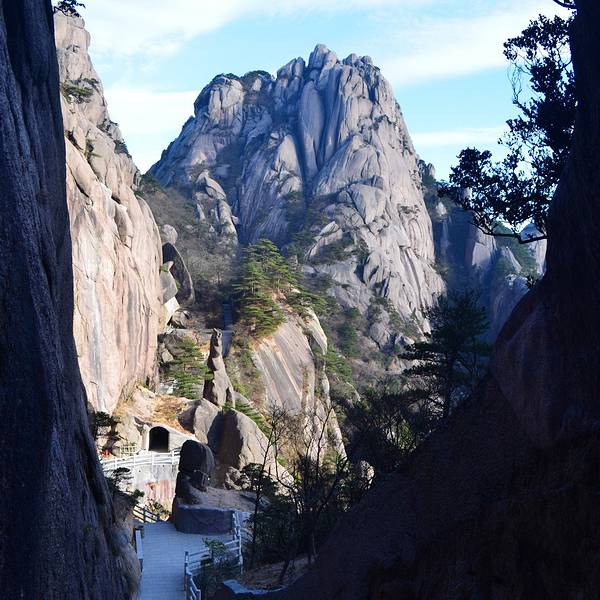黄山山体主要由燕山期 花岗岩构成,垂直节理发育,侵蚀切割强烈,断裂和裂隙纵横交错,长期受水溶蚀,形成瑰丽多姿的花岗岩洞穴与孔道,使之重岭峡谷,关口处处,全山有岭30处、岩22处、洞7处、关2处。