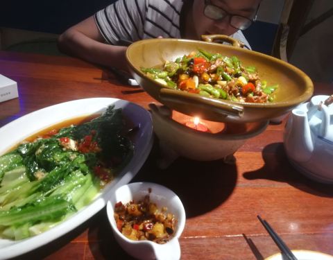 - 二萌美团了一家当地特色菜的餐厅,无奈排队的人很多,只好另寻他家。当然,这家的饭菜也是蛮合胃口的