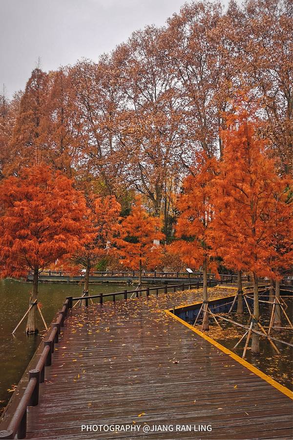 🌲翠州旁的旭桥一定要走一走,我来的时候是下雨天,天晴应该会更好看。这里有一小片水中落羽杉,棕色的树叶如同羽毛般轻盈飘逸,正值优质观赏期。
