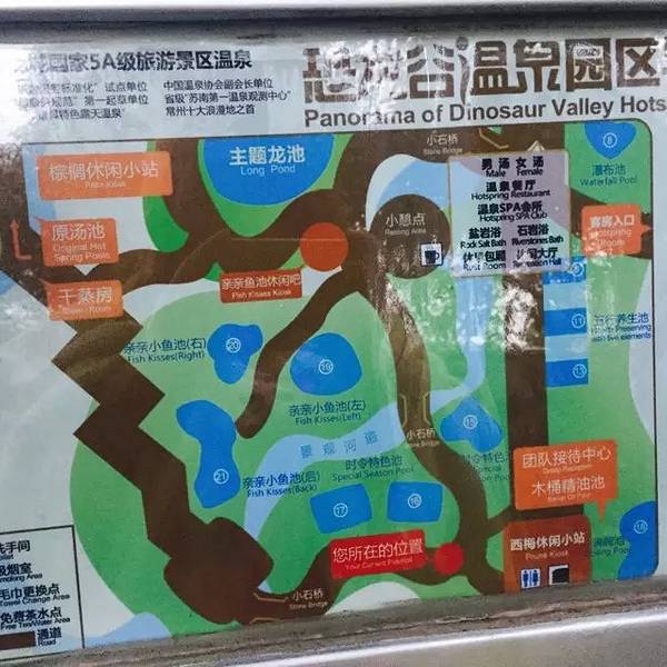 温泉是提前网上预订好的,票价100出头。到场扫描二维码换手牌。温泉区域都是手机拍照的。入口的主题龙池温泉池是最大的一个了,很多小孩子在这里学游泳,温度38左右。呆萌的大恐龙说:禁止攀爬,禁止跳水。难得找到一处人少的 赶快多泡一会儿恐龙谷温泉地图 可以清楚的找到自己所在的位置。曲径通幽,小木屋旁边都是成片的小竹林。累了可以坐下来歇歇脚的长廊和椅子温泉池旁边都附有挂浴巾的衣架,旁边有写编号,所以不用担心拿错。恐龙谷温泉有龙池生烟、金玉环壁、灵雀暖巢、三叠漱玉、苔壁水镜、 雀林清音、洞天日归、幽潭积雾,温泉八景。因为游客太多,所以都木有拍。鱼疗是另外收费的 不怕痒的可以试试,亲亲鱼可以去死皮,老化角质。温泉池有辣椒池 生姜池 小鱼池 红酒池等等,还有汗蒸室和娱乐休闲设施。