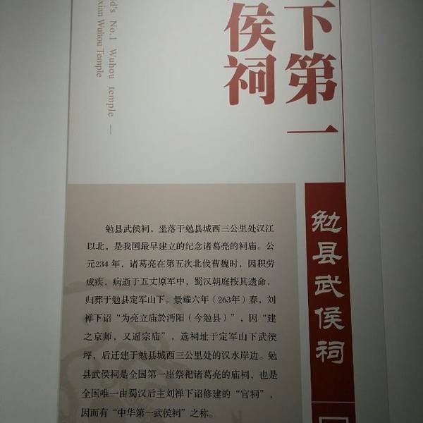 实用 勉县武侯祠是修建的最早的武侯祠,由蜀后主刘禅下令修建,有天下第一武侯祠之称,里面古木参天,历朝历代纪念的牌匾、碑刻很多,游览时间大概需要30分钟至1小时,很值得一去。不好的印象:2023年1月25日,售票人...勉县武侯祠是修建的最早的武侯祠,由蜀后主刘禅下令修建,有天下第一武侯祠之称,里面古木参天,历朝历代纪念的牌匾、碑刻很多,游览时间大概需要30分钟至1小时,很值得一去。不好的印象:2023年1月25日,售票人员明显看着是学生,手机里存着高考录取通知书和学生证照片,就是不认可,必须要学生证原件。全国许多地方都全域免费旅游了,鼠目寸光,只知道挣门票钱。