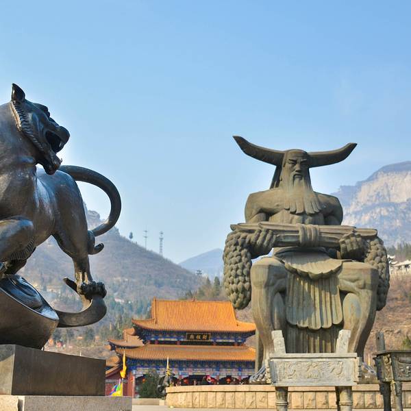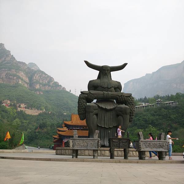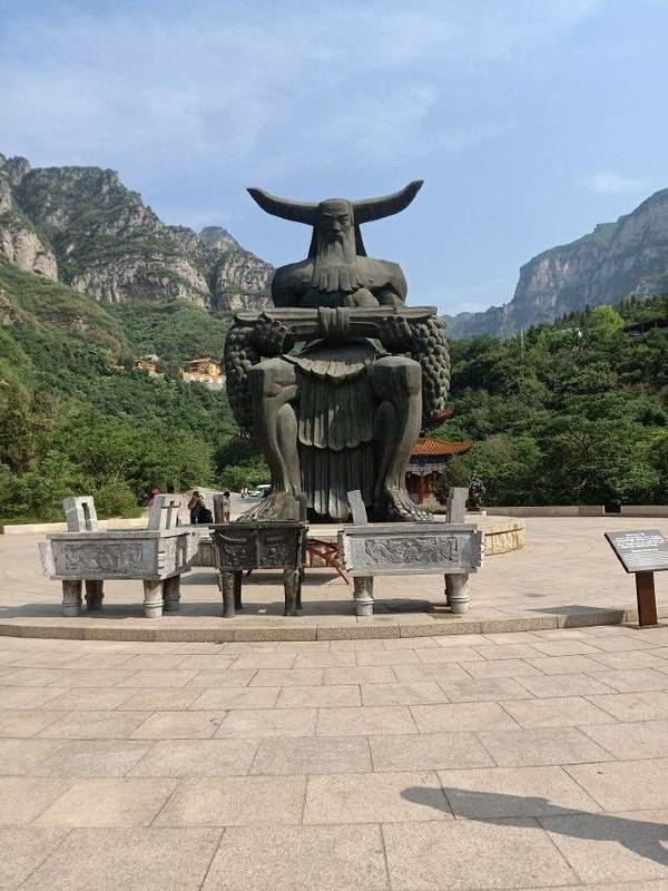 过了“祭拜坛”是一座整齐的石桥,桥的对面有一座巨大的“神农”铜像。在铜像的后面有一座寺庙“财祖庙”(我没进去),寺庙的旁边就是第二程电瓶车的乘坐点。