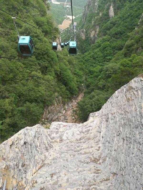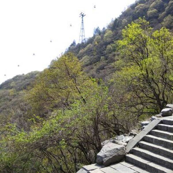 坐上第二程的电瓶车同样不超过十分钟给游客送到一个木质台阶下。司机对我说:顺着台阶往上爬就能看见上山的索道了。