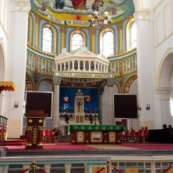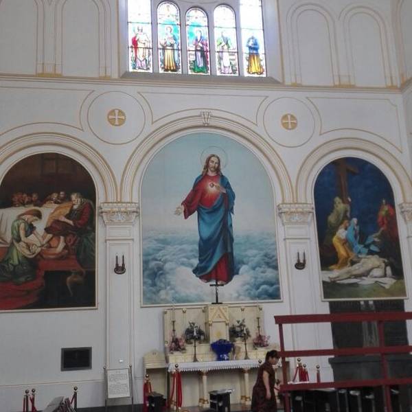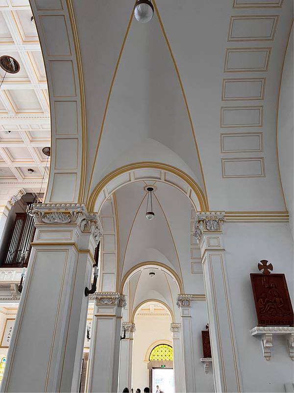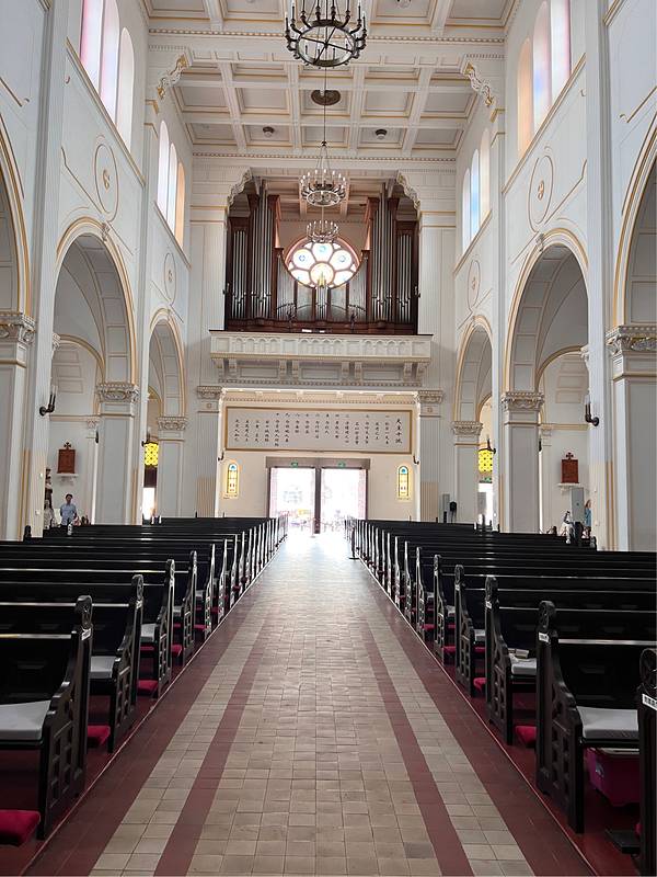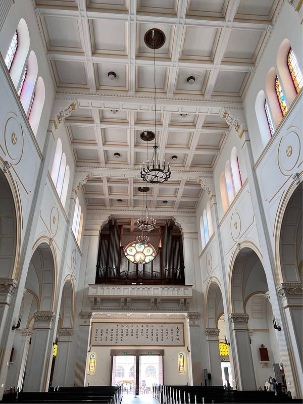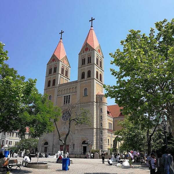 圣弥厄尔教堂建成于1934年,拥有宏伟的尖塔,是青岛有名的西洋建筑。教堂表面雕有简洁优美的纹案,加上淡色的墙体,带一点粉色的红屋顶,色彩丰富而又甜美,吸引了无数拍婚纱照的新人。 走进教堂,首先给人的感觉是宽敞明亮,大厅高十余米,中间是过道,两旁有一排排座位,再两旁是走廊,每一条走廊上立着两个供神甫接待信徒忏悔告解用的告解亭。过道和走廊的尽头是祭台,祭台上方的穹顶绘着精美的壁画,而教堂中亮眼的要属一扇扇彩绘玻璃窗,透射出柔和的光线。 每逢周日教堂会做主日弥撒,不过弥撒时间不可以在教堂里跑来跑去到处参观,只能静静地坐在后排,不能大声喧哗。教堂里有一架从德国进口价值不菲的管风琴,长得有点像钢琴,只有在主日弥撒时才会奏响。 圣弥厄尔教堂周边景点众多,沿着中山路往北走,就是以美食著称的劈柴院;沿中山路往南可以一直走到海边的栈桥,然后沿着海滨游玩;从教堂往东,信号山公园等,你可以根据自己的喜好安排游览路线。