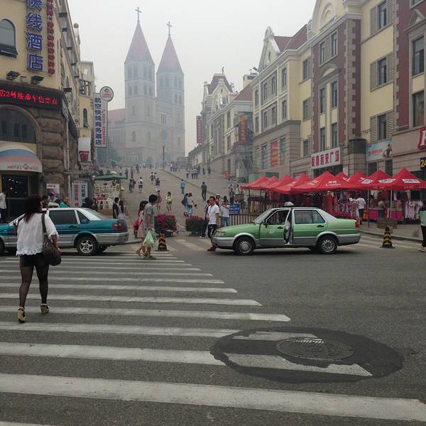 我的路线:我先是乘公交车到栈桥,看完后一路沿着海边走到火车站,在向北,逛了中山路百盛商场,出来沿着中山路,走大约300多米右转有个小上坡的柏油马路——曲阜路,就能到达,远远的也能看到2个高高的钟楼。