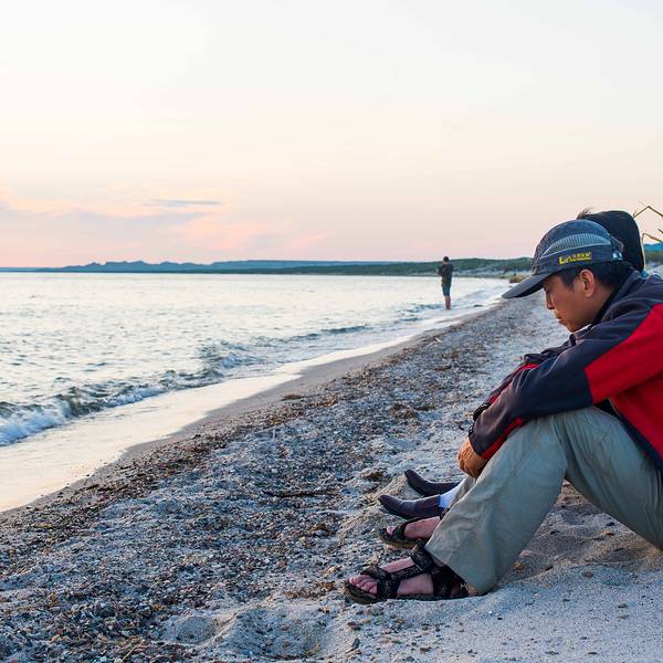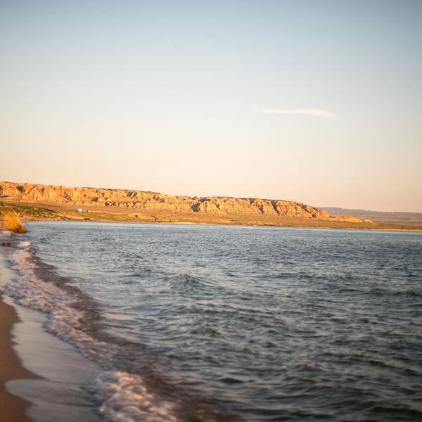 福海海滨旅游区即乌伦古湖,位于准噶尔盆地西北边缘,分为大海子和小海子两部分,其中大海子是咸水湖,小海子(吉力湖)是淡水湖。两湖之间有省道穿过。 大海子东岸靠近省道的地方有一片细腻洁白的沙滩,长约十公里,适合进行冲浪、划船、滑板等水上娱乐。这里湖水清澈,湖岸芦苇丛生,黄昏可观晚霞落日,景色迷人。 小海子在大海子南边,湖中有一鸟岛,海鸥、天鹅、野鸭……成群结队,翩然而至。湖中盛产鱼类,岸边小馆子里有全鱼宴,不可不尝。
