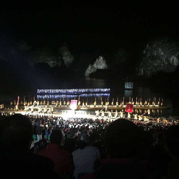 整个表演场面很宏大,它以漓江为整个舞台背景,第一次去看不得不说非常震撼,演员的服装很统一又有特色,表演很专业,不过距离稍远,看不清具体模样。有漓江渔火、舞蹈表演、苗族姑娘唱山歌等等,表演有一个多小时,安排的很流畅也很紧凑,灯光效果也非常好,是一场高质量高水准的实景舞台剧,也特别适合带老人和孩子去看,觉得值回票价。不过听说演员都是当地的居民,白天打鱼种地,晚上就去刘三姐演出,哈哈,所以他们所表演的也确实是他们生活的真实写照。。。 展开