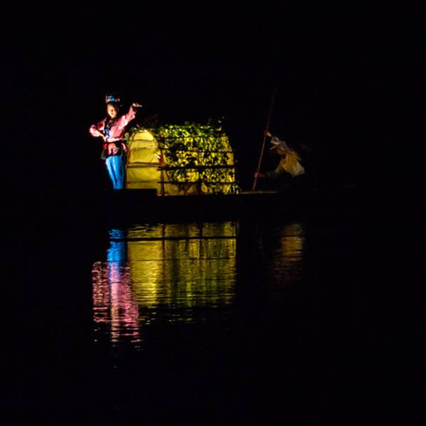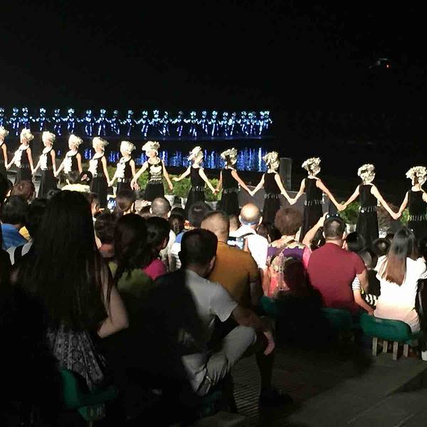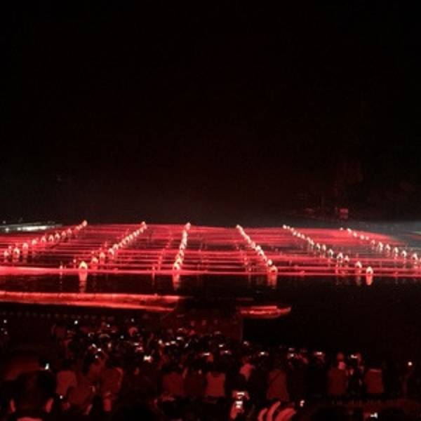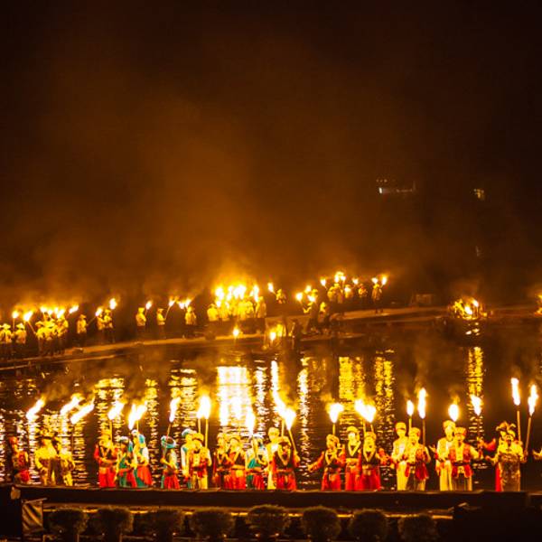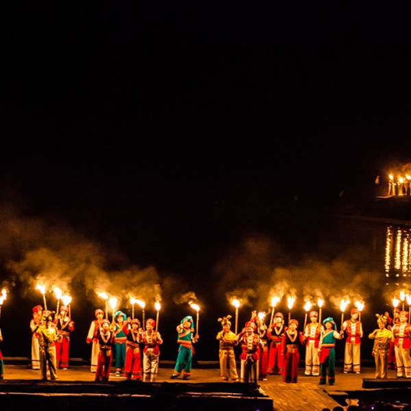 2.由阳朔县城前往演出点,可以由步行街口与其他乘客一同拼车前往,或者搭乘正规出租车前往。一叶轻舟缓缓由水面划过,刘三姐的一曲高歌,拉开了演出的序幕生活在这里的各族人民,手举火把,放声高歌,场面宏伟而壮观。火把汇集于四面八方,将整个漓江点明,营造出一派梦幻的场景。渔人们动作整齐划一,挥舞着红色的绸带,好似随风摇曳的波涛,气势汹涌。五十年前,电影《刘三姐》诞生于此。 影片中美丽的桂林山水、美丽的刘三姐、美丽的山歌迅速风靡全国。从此,前来游览桂林山水、寻访刘三姐和广西山歌,便成了一代又一代人的梦想。如今,亲自走进《印象刘三姐》,仿佛梦想成真,寻到了久违的感动。桂林之梦,是涌动的流水,缠绵而充满力度;桂林之梦,是摇曳的轻舟;每次前进,都离梦想更近一步;梦在前方,在绿水青山之中,纵情荡漾;关于山水的梦想,常有那唯美的星空相伴;关于山水的梦想,常有那静静流淌的溪流相伴;关于山水的梦想,常有那静静伫立的亭台楼阁相伴;这灯火阑珊的夜晚,圆了心中久违的梦想,穿过迷离的灯光,极目远眺,满眼绚烂的辉煌; 在气势宏伟的侗族大歌之中,演出画上了完满的句号。 展开